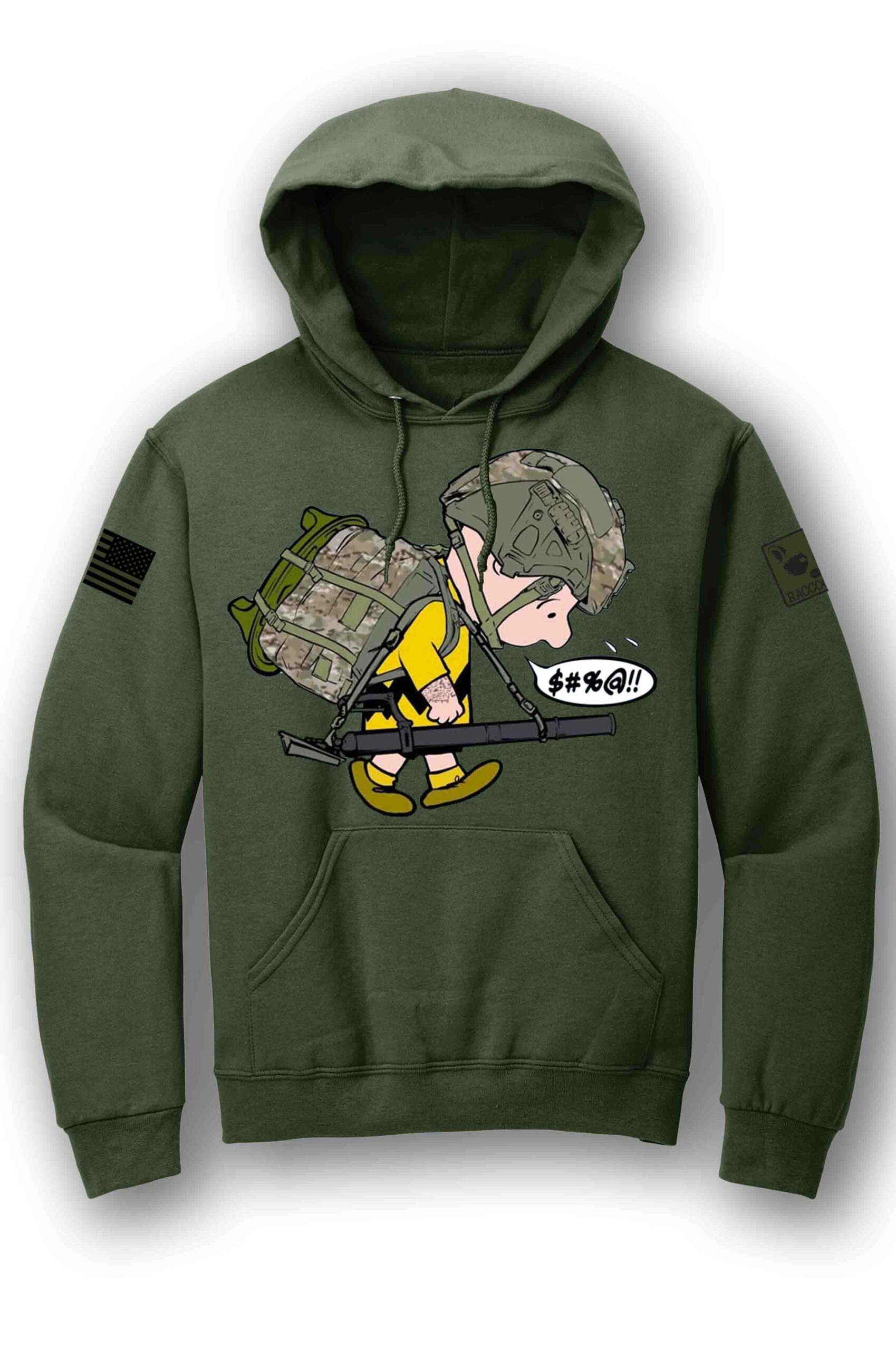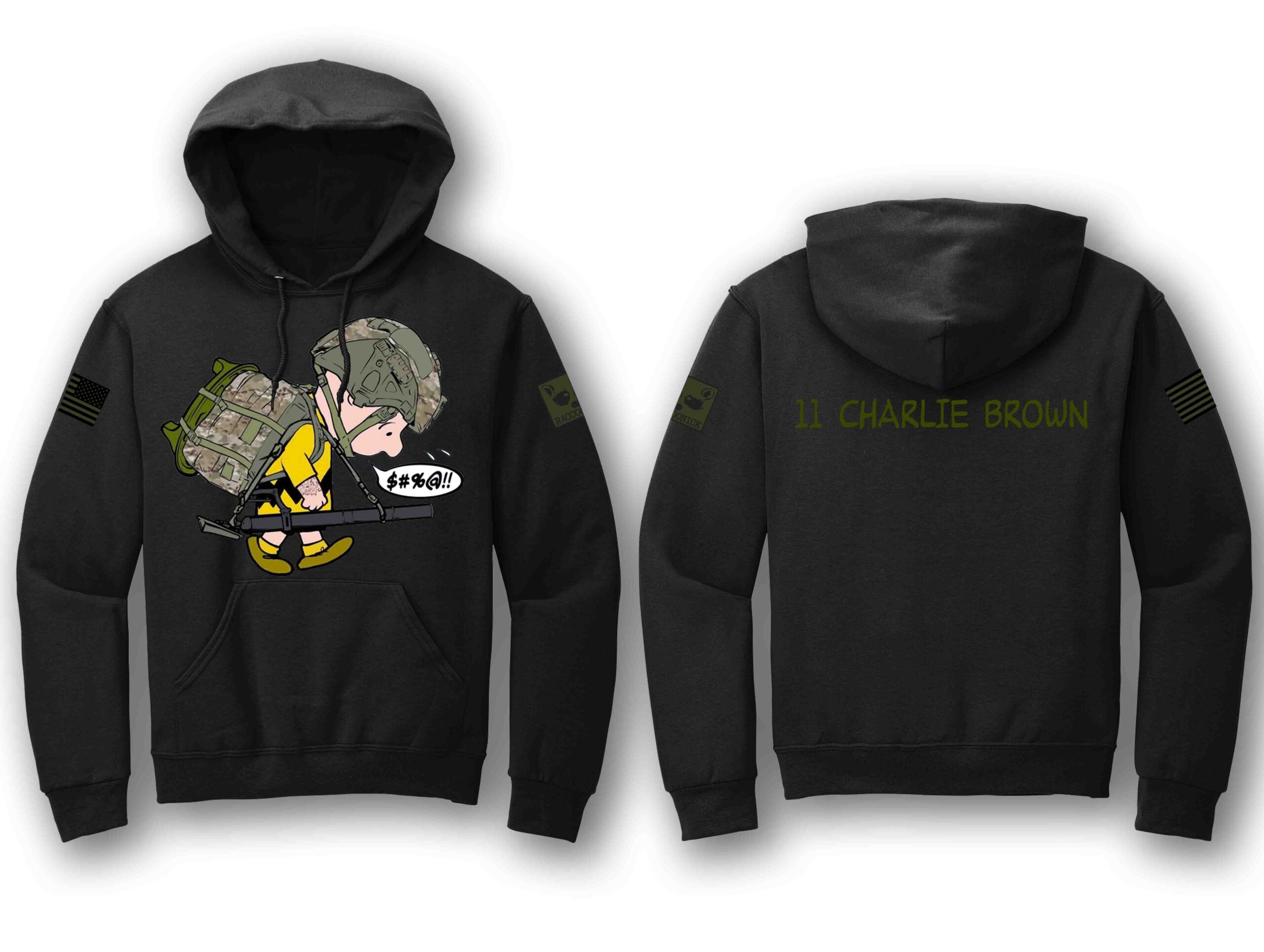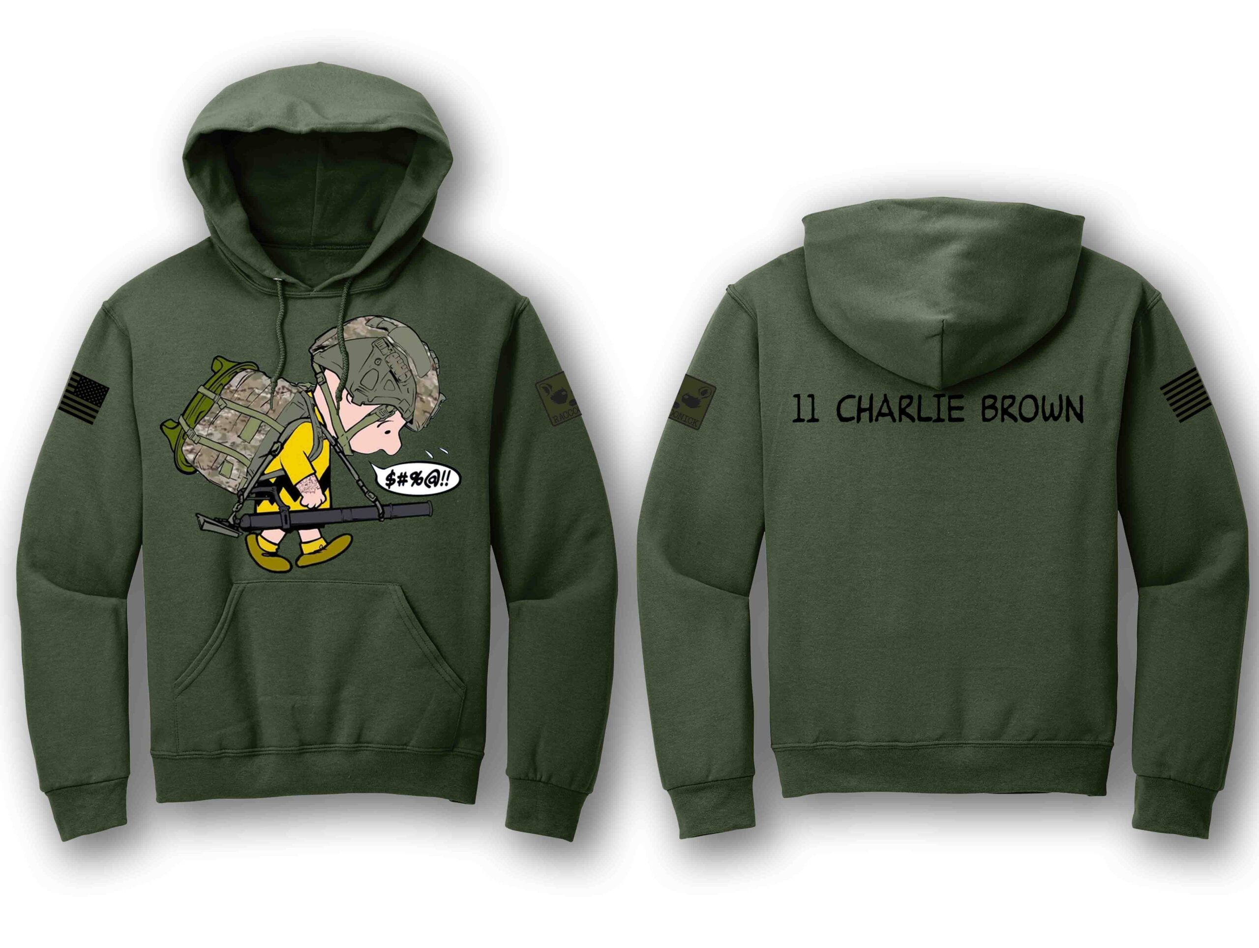 Hoodie with full color logo on front, 11 CHARLIE BROWN on back.  Subdued US FLAG on right sleeve and RACCOONICK logo on left sleeve.